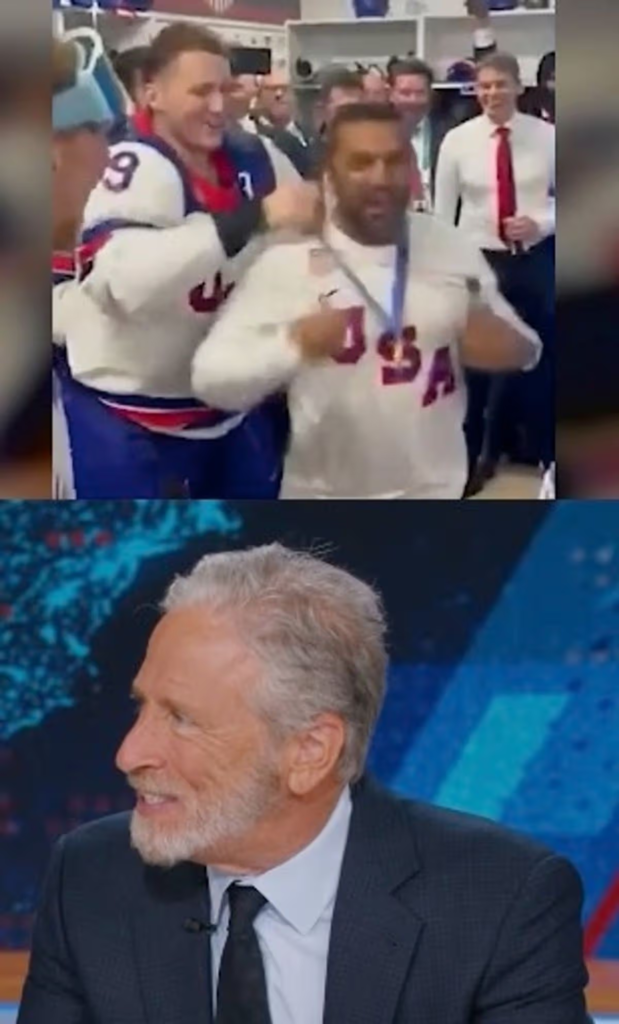 Jon Stewart halted the Daily Show last night to make fun of “crazy eyes” Kash Patel after Team USA’s hockey win at the Winter Olympics.