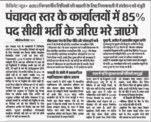 नोट: इस लेख में प्रस्तुत Bihar Panchayati Raj Clerk Vacancy 2025 से जुड़ी सभी जानकारियां विभिन्न समाचार स्रोतों, मीडिया रिपोर्ट्स और संभावित आधिकारिक अपडेट्स के आधार पर तैयार की गई हैं। किसी भी प्रकार का आवेदन करने से पहले उम्मीदवारों से अनुरोध है कि वे बिहार कर्मचारी चयन आयोग (BSSC) की आधिकारिक वेबसाइट bssc.bihar.gov.in पर उपलब्ध नवीनतम अधिसूचना को ध्यानपूर्वक पढ़ें और सभी तथ्यों की स्वप्रमाणित पुष्टि अवश्य करें।