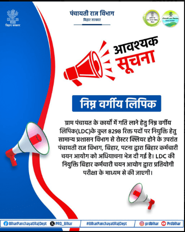| Lower Division Clerk (LDC) | 8,298 | 12वीं पास + कंप्यूटर और टाइपिंग स्किल्स (वांछनीय) | Panchayati Raj Department, Bihar |