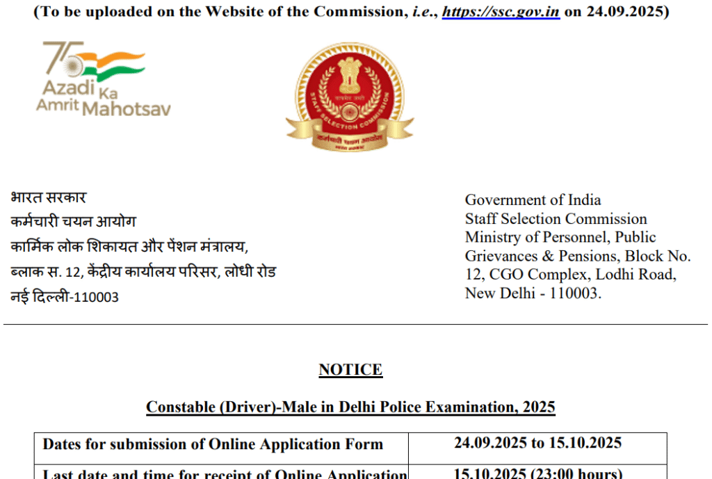 दिल्ली पुलिस ड्राइवर भर्ती का आधिकारिक नोटिफिकेशन जारी हो चुका है। इस भर्ती में कुल 737 पद शामिल हैं, जिनके लिए आवेदन पूरी तरह से ऑनलाइन मोड में SSC की आधिकारिक वेबसाइट के माध्यम से किए जा सकते हैं। आवेदन प्रक्रिया 24 सितंबर 2025 से शुरू होकर 15 अक्टूबर 2025 तक चलेगी। आवेदन शुल्क और पात्रता संबंधी सभी विवरण नोटिफिकेशन में विस्तार से बताए गए हैं। अगर आप ड्राइवर बनने का सपना देख रहे हैं तो इस अवसर को हाथ से जाने मत दीजिए। आवेदन करने से पहले नोटिफिकेशन जरूर पढ़ लें।