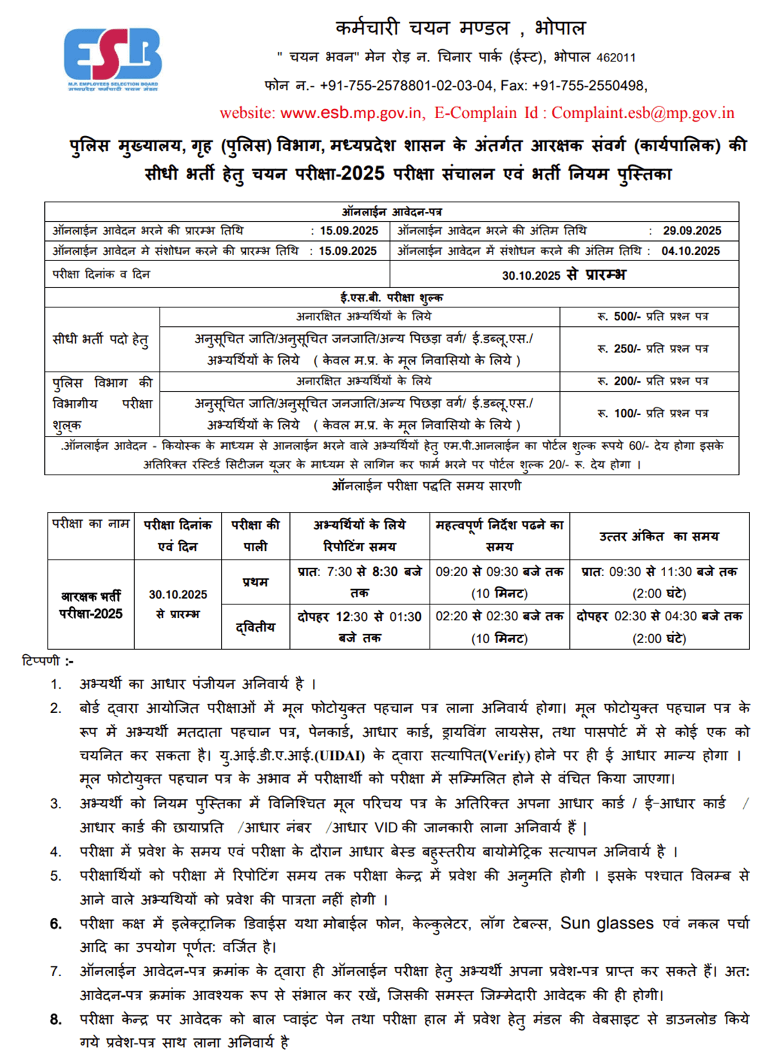यह भर्ती मध्य प्रदेश में रहने वाले योग्य उम्मीदवारों के लिए निकाली गई है। आवेदन प्रक्रिया पूरी तरह ऑनलाइन है और इच्छुक उम्मीदवार निर्धारित समय के भीतर आवेदन कर सकते हैं। भर्ती प्रक्रिया में अभ्यर्थी की योग्यता, उम्र, और शारीरिक मानकों का विशेष ध्यान रखा जाएगा। तो चलिए जानते हैं Mp Police Constable Vacancy 2025 की पूरी डिटेल्स।
