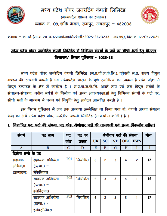 मध्य प्रदेश पावर जनरेटिंग कंपनी लिमिटेड Recruitment 2025 की नोटिफिकेशन जारी हो चुकी है जिसमें कुल 346 पदों (AE, JE, Chemist, Office Assistant, Store Assistant, Group C & D) पर भर्ती की जाएगी। यह मौका मध्य प्रदेश के युवाओं के लिए एक बेहतरीन गेटवे है। चयन लिखित परीक्षा, फिजिकल टेस्ट तथा दस्तावेज़ सत्यापन के आधार पर होगा। योग्य उम्मीदवार तुरंत ऑनलाइन आवेदन कर सकते हैं।