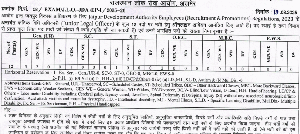 RPSC Junior Legal Officer Recruitment 2025 में कुल 12 पदों के लिए भर्ती हो रही है, जिसमें विभिन्न वर्गों के लिए पद निर्धारित हैं। यह भर्ती जयपुर विकास प्राधिकरण में कनिष्ठ विधि अधिकारी पदों के लिए है जो राजस्थान के पात्र उम्मीदवारों के लिए रोजगार का अवसर प्रदान करती है।