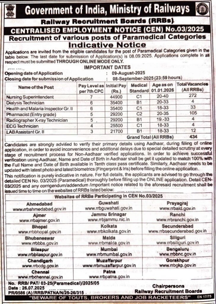 रेलवे भर्ती बोर्ड (RRB) ने Paramedical स्टाफ के 434 पदों के लिए भर्ती का शॉर्ट नोटिस जारी कर दिया है। यह भर्ती Nursing Superintendent, Pharmacist, Lab Assistant, ECG Technician जैसे पदों के लिए आयोजित की जा रही है। आवेदन प्रक्रिया 09 अगस्त 2025 से शुरू होकर 08 सितंबर 2025 तक चलेगी। परीक्षा कंप्यूटर आधारित होगी और चयन मेरिट व मेडिकल के आधार पर किया जाएगा।