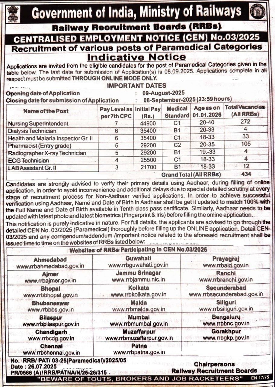 रेलवे भर्ती बोर्ड (RRB) ने Paramedical स्टाफ के 434 पदों के लिए भर्ती का शॉर्ट नोटिस जारी कर दिया है। यह भर्ती Nursing Superintendent, Pharmacist, Lab Assistant, ECG Technician जैसे पदों के लिए आयोजित की जा रही है। आवेदन प्रक्रिया 09 अगस्त 2025 से शुरू होकर 08 सितंबर 2025 तक चलेगी। परीक्षा कंप्यूटर आधारित होगी और चयन मेरिट व मेडिकल के आधार पर किया जाएगा।